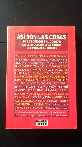 Debate, Madrid, 1996, Edición a cargo de John Brockman y Katinka Matson. Traducción: Juan Manuel Ibeas. Rústica con solapas. 21 cm. 311 p. Firma y fecha manuscrita. , Encuadernación de tapa blanda, buen estado Si no se especifica en la descripción anterior, los libros no tienen subrayados, anotaciones, firmas o defectos reseñables. ATENCIÓN: EL ENVÍO GRATUITO ES ORDINARIO SIN NÚMERO DE SEGUIMIENTO, y puede sufrir retrasos de varios días. Le dejarán un aviso en el buzón PARA LA RECOGIDA EN OFICINA. PRIORITARIO/CERTIFICADO CON ENTREGA A DOMICILIO POR SOLO 2,90 euros. |