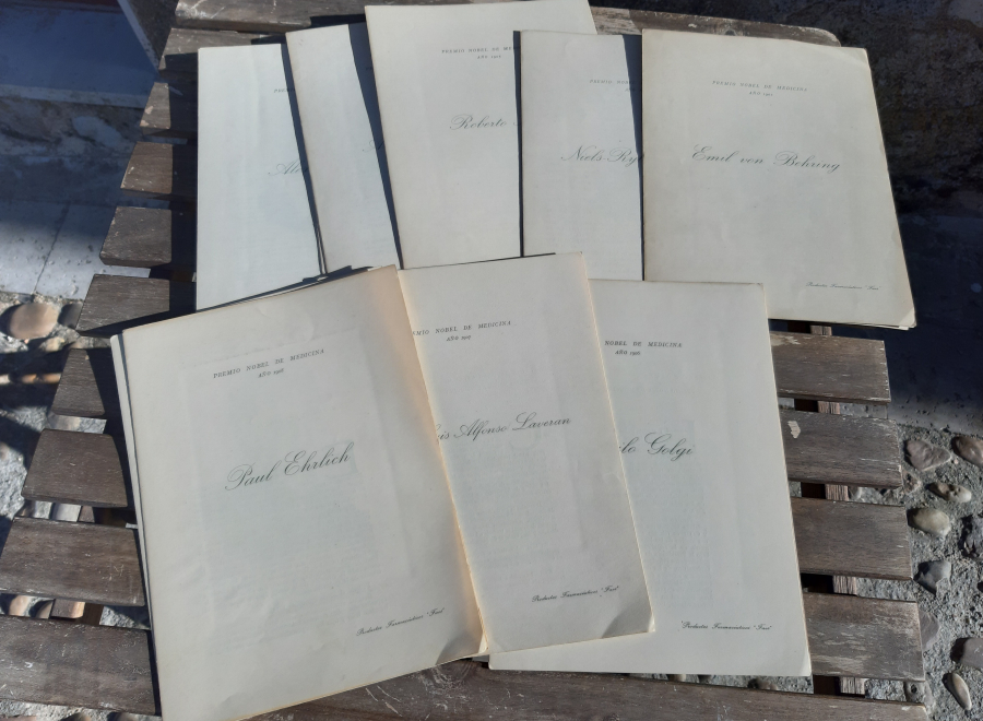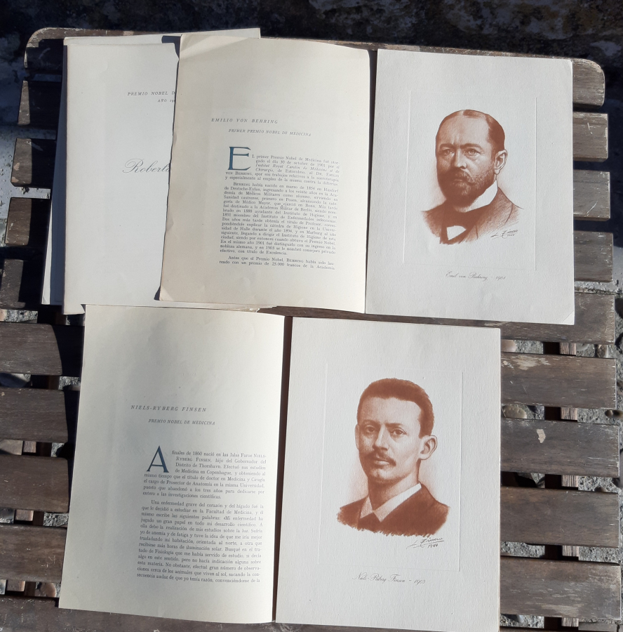 26 carpetillas que contiene cada una retrato del premio nobel y descripción de los siguientes: EMIL VON BEHRING 1901, NIELS RIBERG FINSEN 1903, JUAN PETROVITCH PAWLOW 1904, ROBERTO KOCH 1905, CAMILO GOLGI 1906, SANTIAGO RAMON Y CAJAL 1906, CARLOS LUIS ALFONSO LAVERAN 1907, PAUL EHRLICH 1908, ELIE METCHNIKOFF 1908, THEODORE KOCHER 1909, ALBRECHT KOSSEL 1910, ALLVAR GULLSTRAND 1911, ALEXIS CARREL 1912, CHARLES RICHET 1913, ROBERT BARANY 1914, JULES BORDET 1919, AUGUSTO KROGH, 1920, ARCHIBALD VIVIAN HILL 1921, OTTO MEYERHOF 1922, FREDERICH GRANT BANTING 1923, JOHN JAMES RICHARD MACLEOD 1923, GUILLERMO EINTHOVEN 1924, JULIUS WAGNER FAUREGG 1927, CHARLES NICOLLE 1928, CHRISTIAN EIJKMANN 1929, KARL LANDSTEINER 1930. Si no se especifica en la descripción anterior, los libros no tienen subrayados, anotaciones, firmas o defectos reseñables. ATENCIÓN: EL ENVÍO GRATUITO ES ORDINARIO SIN NÚMERO DE SEGUIMIENTO, y puede sufrir retrasos de varios días. Le dejarán un aviso en el buzón PARA LA RECOGIDA EN OFICINA. PRIORITARIO/CERTIFICADO CON ENTREGA A DOMICILIO POR SOLO 2,90 euros. |